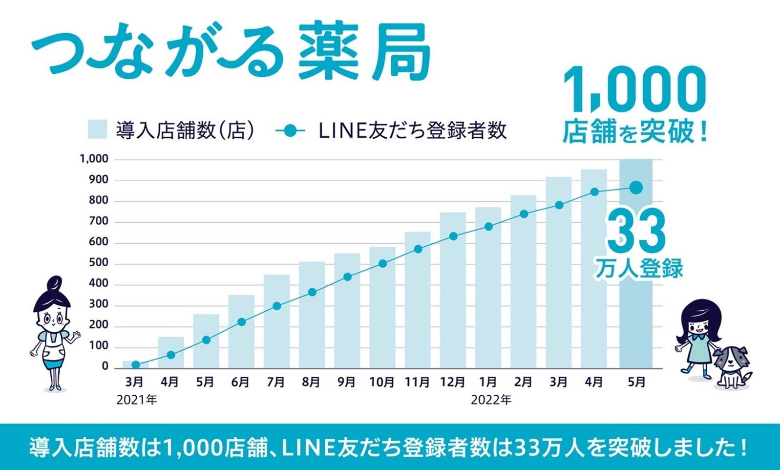当社は、患者と薬局がつながる「かかりつけ薬局化」を支援するLINE公式アカウント「つながる薬局」サービスを昨年3月より開始。本年5月13日時点で友だち登録数が33万人を突破しております。薬局のLINE公式アカウントとしては圧倒的No.1の実績です。