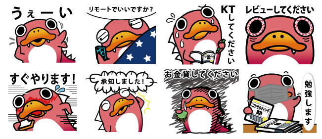 「うぇーい」「リモートでいいですか?」「KTしてください」など、コンサル業界ならではのユニークなスタンプを24種類ラインアップしました。ビジネスシーンを和ませたりプライベートに使ったり、色々な場面でお楽しみいただけるかと思います。是非ご活用ください。