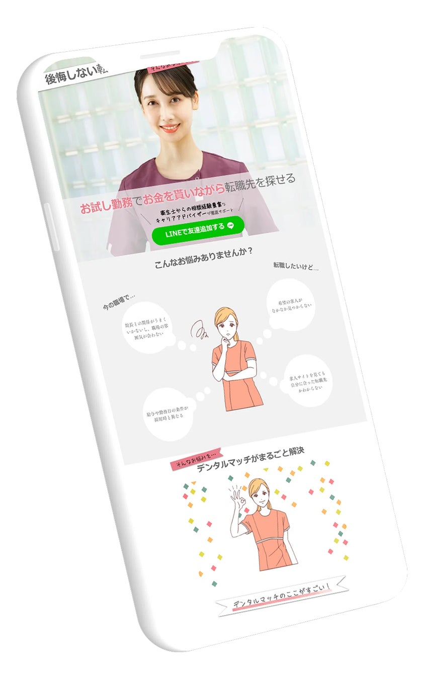 デンタルマッチはLINEで登録することができ、現在の状況や希望状況を回答することでアドバイザーが希望に沿った医院をご提案します。そこで気に入った医院に一日からお試し勤務をすることができ、自分と相性の合う医院を働きながら探すことや柔軟な働き方をサポートします。
