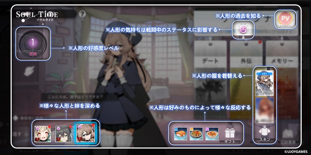 デートでは固有のシナリオに合わせたCGイラストを見ることができます、お気に入りの人形のCGを見るのもデートの楽しみの一つ。たくさんの思い出を共有し、人形たちと深い絆で結ばれましょう。