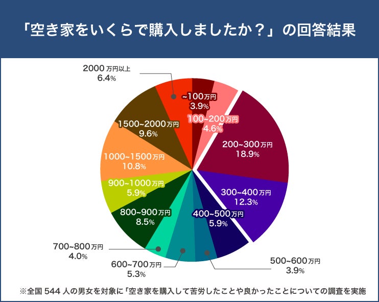 良かったと感じている人の意見を見ると、リフォームが前提だがそれでも安かったと喜ぶ人や、建物が古いためほぼ土地代だけで購入できたという人もいます。実際に、物件を200~400万円程度で購入した人が多く、空き家の価格はかなり安いとわかります。