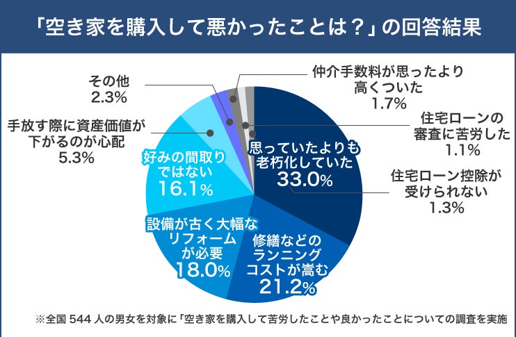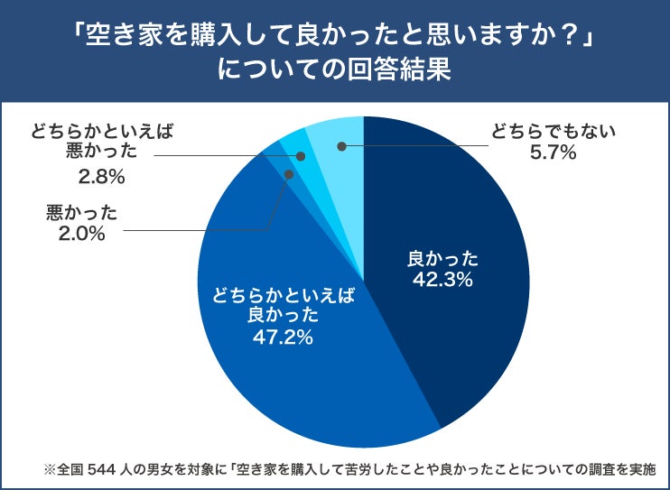 「良かった」と「どちらかといえば良かった」を合わせると、9割の人が空き家を購入して良かったと回答しています。空き家購入を後悔している人は少なく、空き家を購入して良かったと思う人が多いとわかりました。
