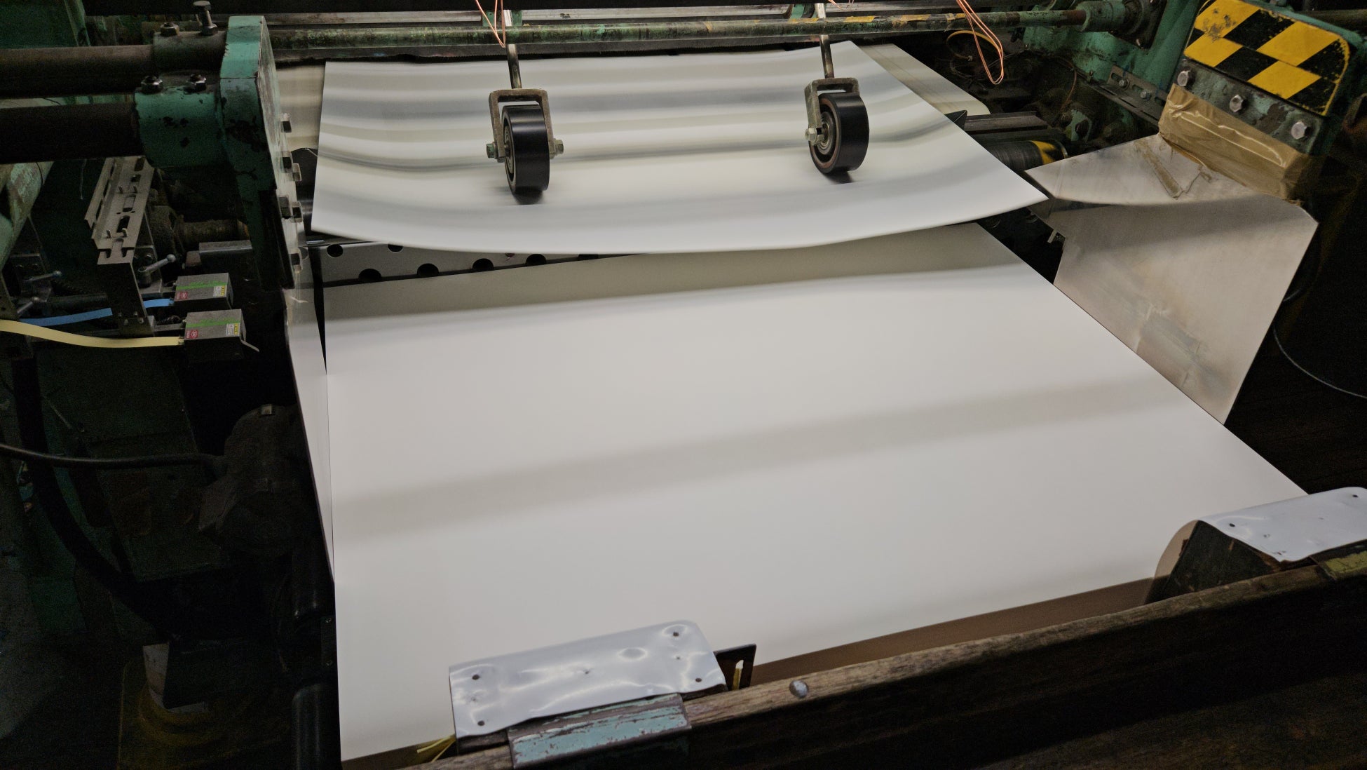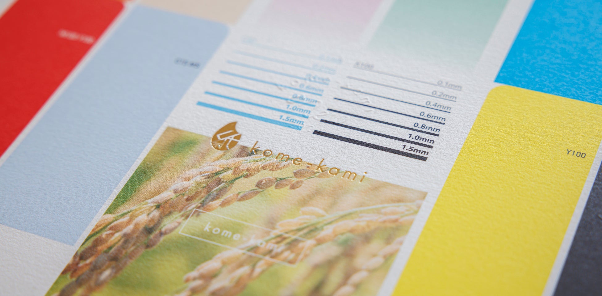 お米とパルプを一体化させた原料を、薄く引き伸ばします。その表面に、お米を原料に使った塗工液「コメグロス」を均一に塗ることで、耐久性や印刷性を付与します。最後にカットして紙が完成します。印刷面に鮮やかな発色と上品なきらめきが見られる、これまでにない紙が誕生しました。