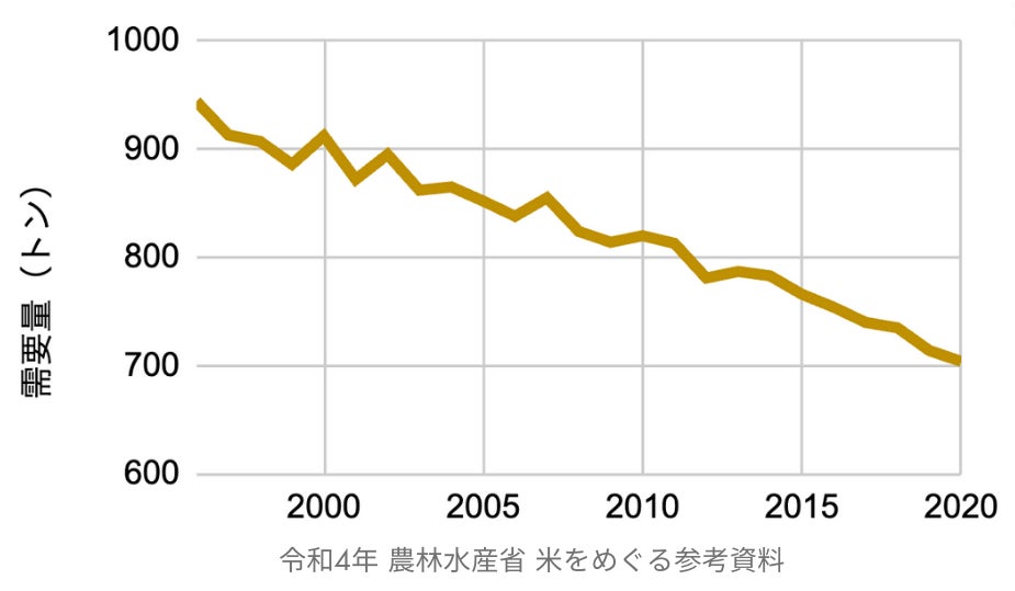 国内のお米の需要は年々減少しています。(※5) 食糧自給率の問題だけでなく、耕作放棄地や休耕田の観点からも、食用だけでなく工業用も含めたお米の需要を増やす必要が高まっています。