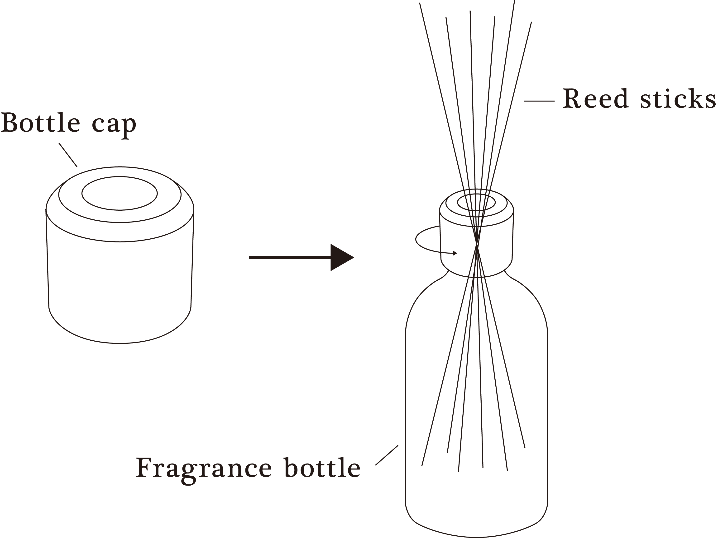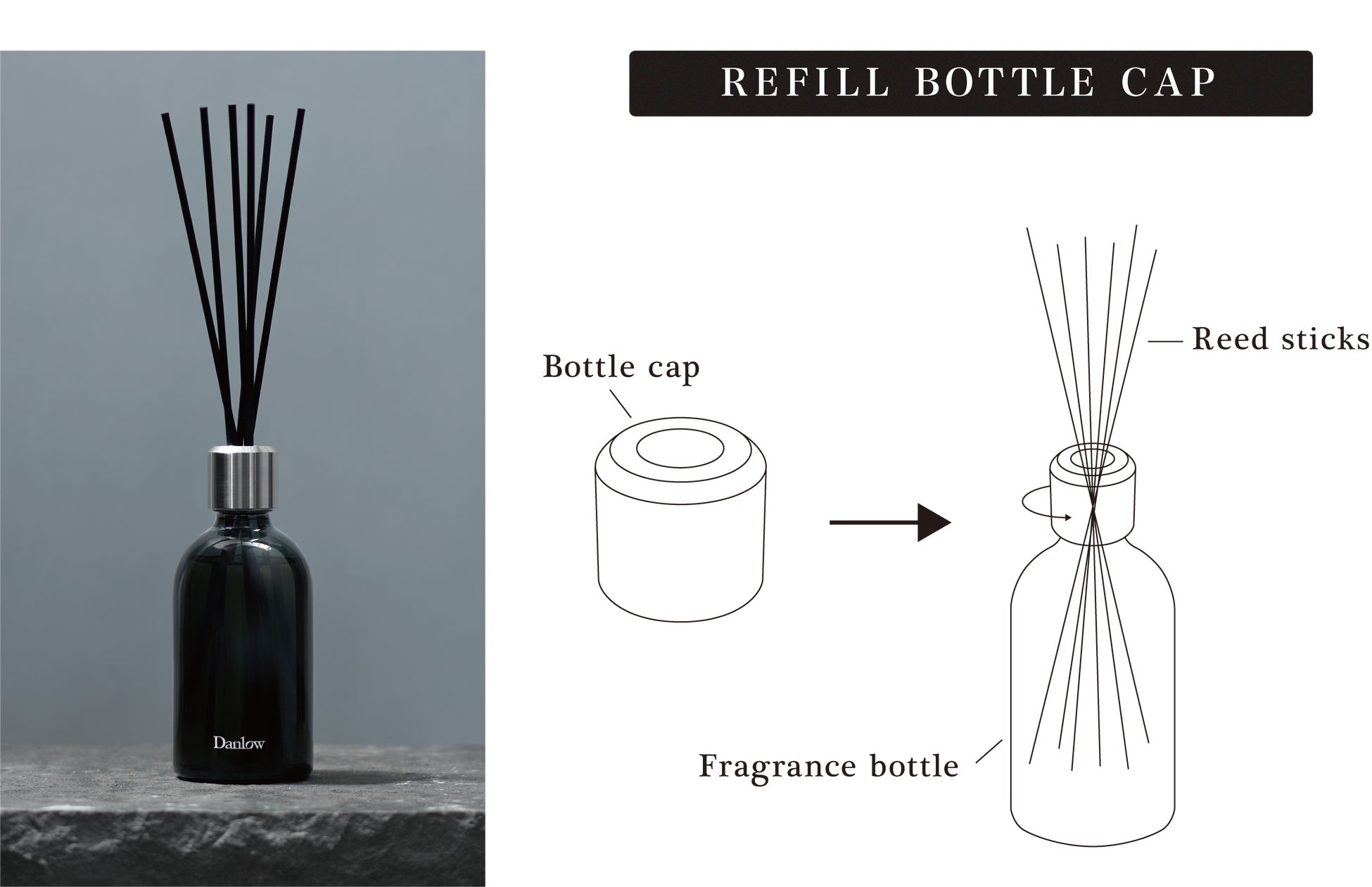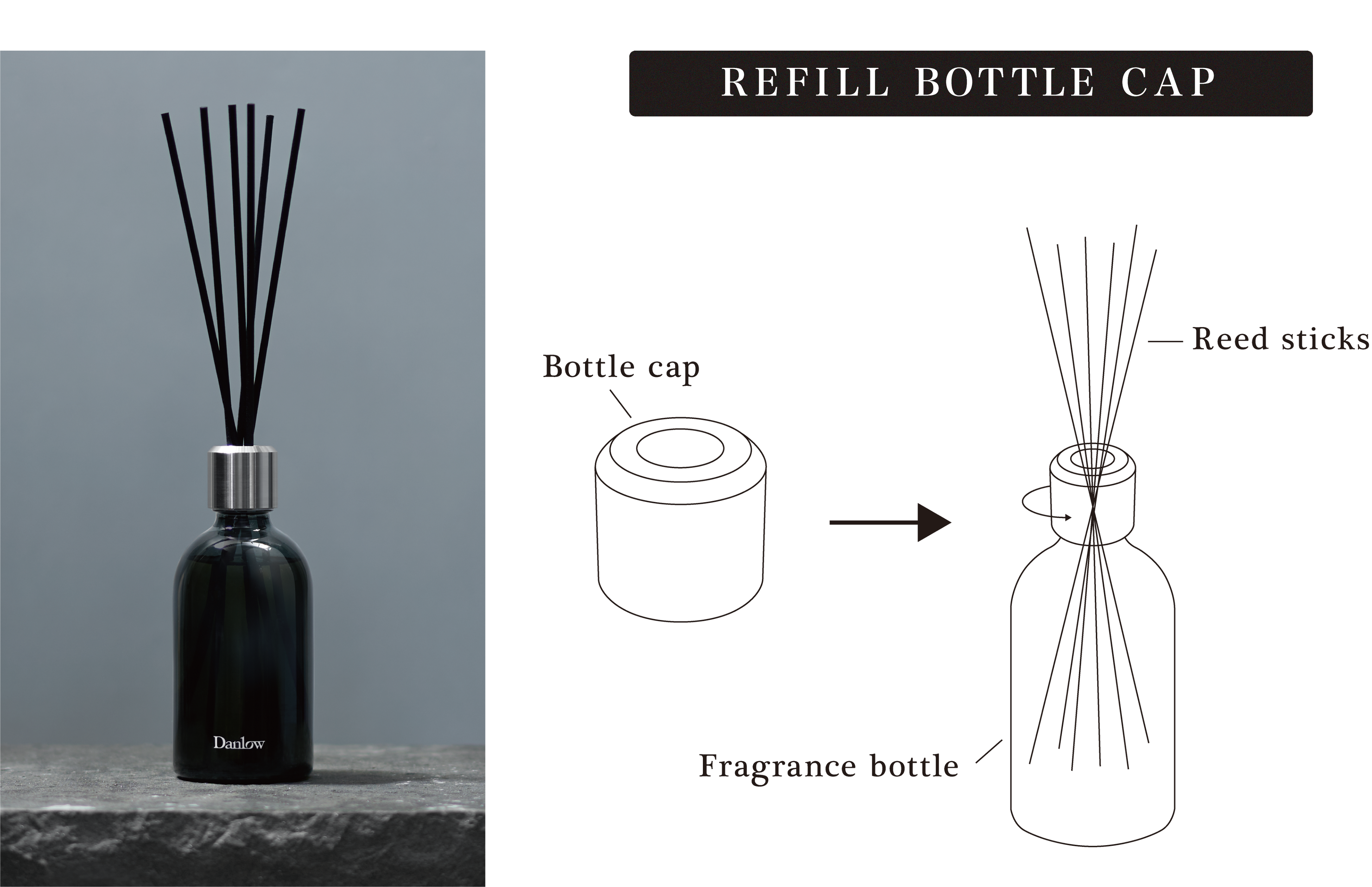 専用のアルミキャップを合わせることで、レフィルボトルの重厚感あるブラックボトルでスタイリッシュな印象でもディフューザーをお楽しみいただけます。