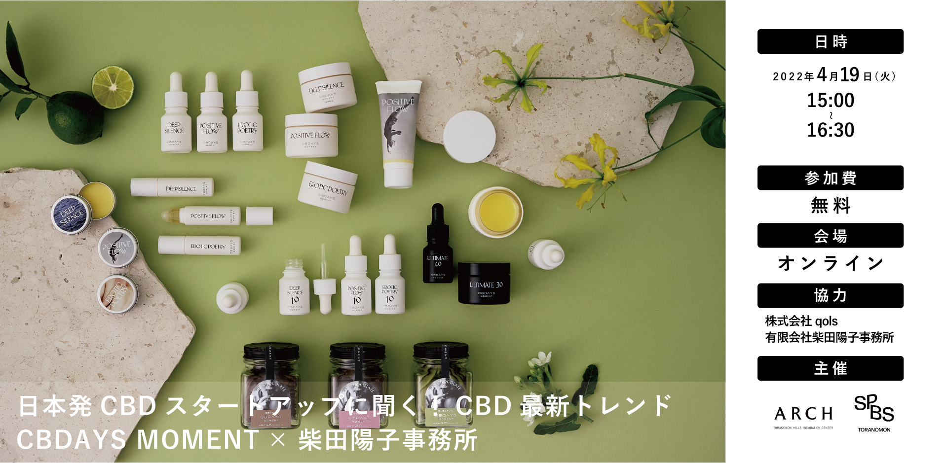 “自分の気持ちは自分でつくる”をコンセプトとする日本発のCBDブランド「CBDAYS MOMENT(シービーデイズモーメント)」を展開する株式会社qols(代表取締役:堀金建吾)は、ブランドのプロデュースを手掛ける有限会社柴田陽子事務所(代表取締役:柴田陽子)と2022年4月19日(火)に「日本発CBDスタートアップに聞く!CBD最新トレンド」と題したオンラインイベントに登壇いたします。