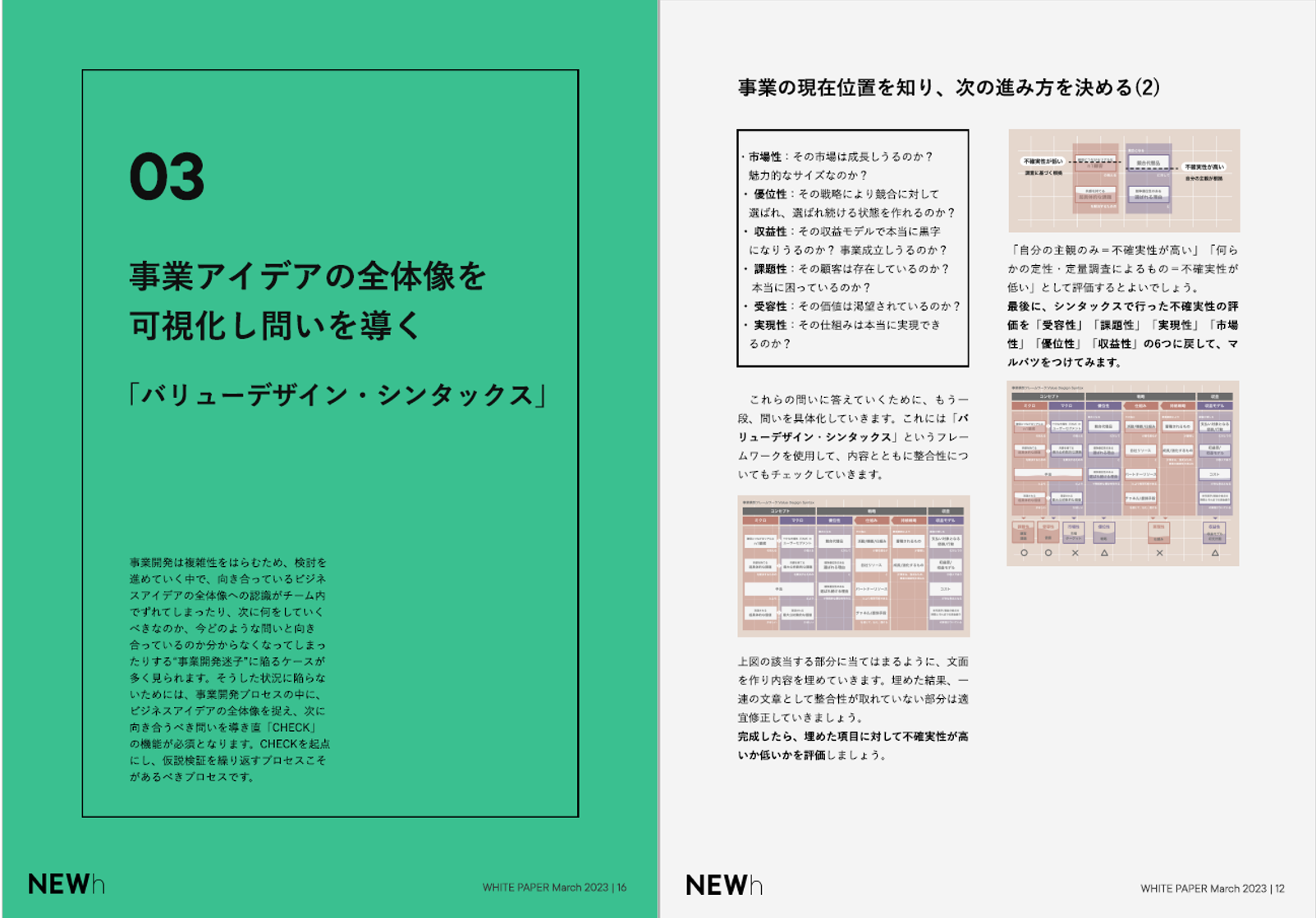 本ホワイトペーパーは新規事業を担当する方々に向け、図版とともに「バリューデザイン・シンタックス」の使い方を説明し、事業構想段階において必要な考え方や進め方を網羅的に解説するものです。新規事業を判断・意思決定する立場にある方々にも、その背景と実践的な活用法を理解していただくことを目的としています。