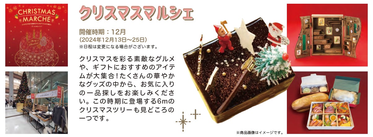 クリスマスを彩る素敵なグルメや、ギフトにおすすめのアイテムが大集合!たくさんの華やかなグッズの中から、お気に入りの一品探しをお楽しみください。この時期に登場する6mのクリスマスツリーも見どころの一つです。