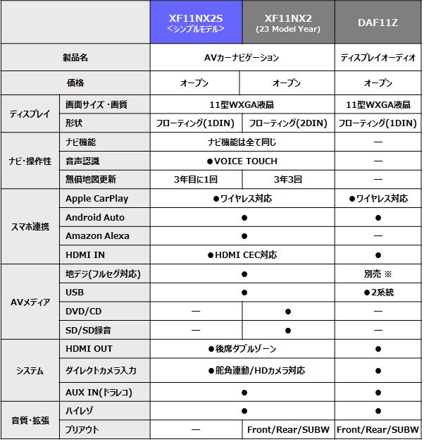 XF11NX2Sの発売で、アルパインの11型大画面フローティングタイプ製品は3モデルをラインアップ(CD/DVD搭載フルスペックタイプ「XF11NX2」、ディスプレイオーディオ「DAF11Z」)。お客様のニーズに合わせて、市販最大となる11型大画面をご利用いただけるようになりました。