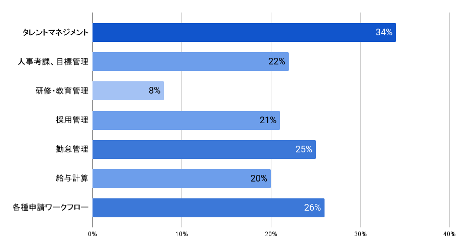 61%の企業において、HR SaaSをすでに利用しているという結果となりました。大手企業では人事データを基幹システムで一元管理しているため、できるだけデータを分散させないよう同一のシステムで統合管理するのが一般的です。しかし近年では、その利便性の高さからベンチャー企業や小規模企業において積極的にSaaSが採用されています。アンケート結果からは、大手企業の人事領域においてもすでに過半数の企業でSaaSの利用実績があることが分かります。