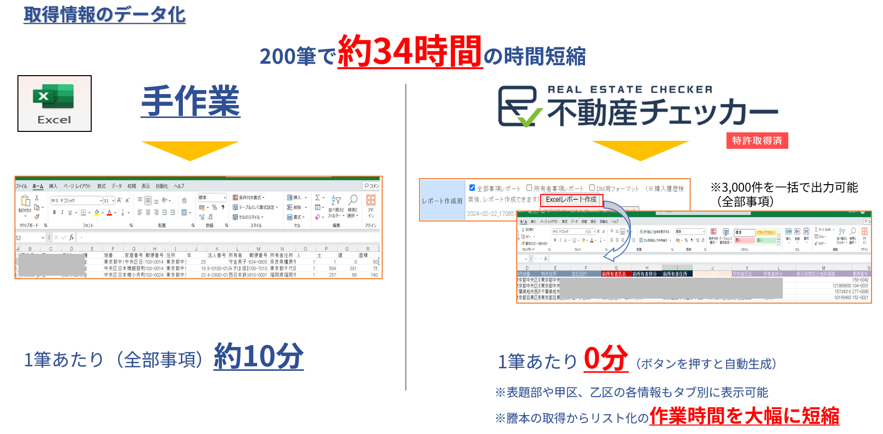 不動産開発や仲介の現場では「有力な物件情報の獲得(仕入れ)」と「権利関係の調査」に膨大な時間とコストがかかっています。法務局での手作業による取得や、散在するデータの統合は、業界全体のDXを阻む大きな課題でした。