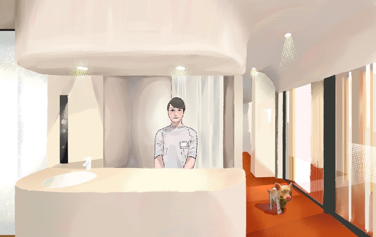 代々木公園店は『やすらぎ』をコンセプトにあげ、pigちゃんと完全個室空間でやすらげるデザインにしました。pigとのふれあいは、「感情が豊かになる」「心が安らぐ」「行動への意欲がわく」など精神面での効果が期待できます。ふれあいによって、やわらかな温もりを感じ、癒され、心のゆとりや充実感が得られるようにやわらかな曲線の空間をデザインしました。