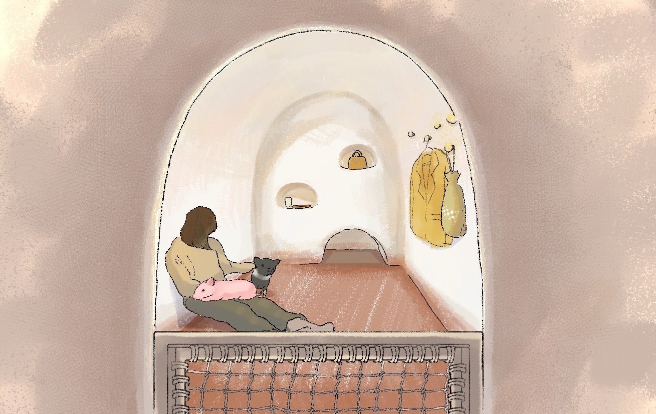 3A TERRACEの2階へ上がると、受付でスタッフがお出迎え。洞穴のようなまあるい入り口を潜ると、pigとのふれあいを独占できるプライベートルームになっています。