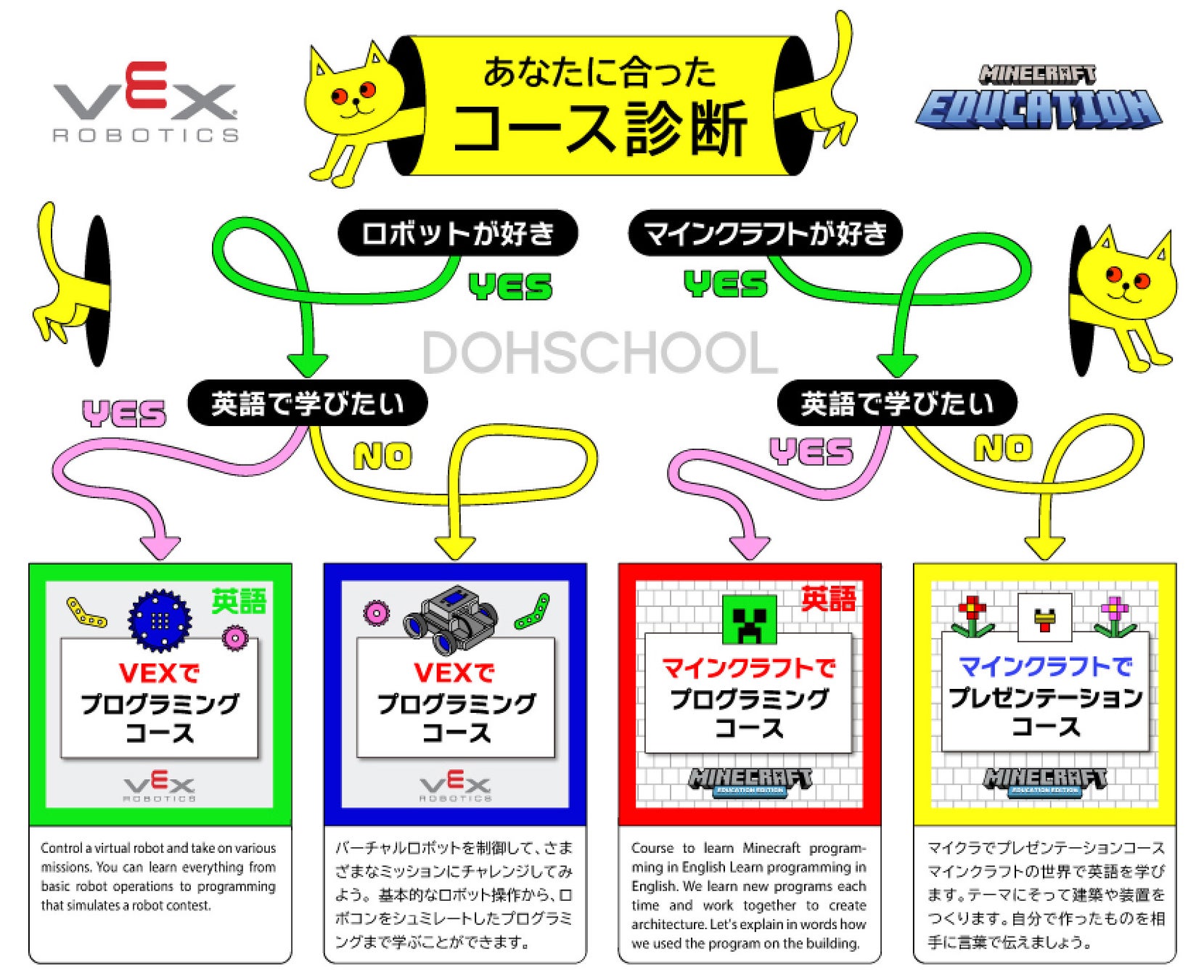 VRを活用したロボットプログラミングや、マインクラフトを通じて英語をどこからでも学べる、オンライン上の家庭教師サービス「DOHSCHOOLオンライン」がオープンしました。