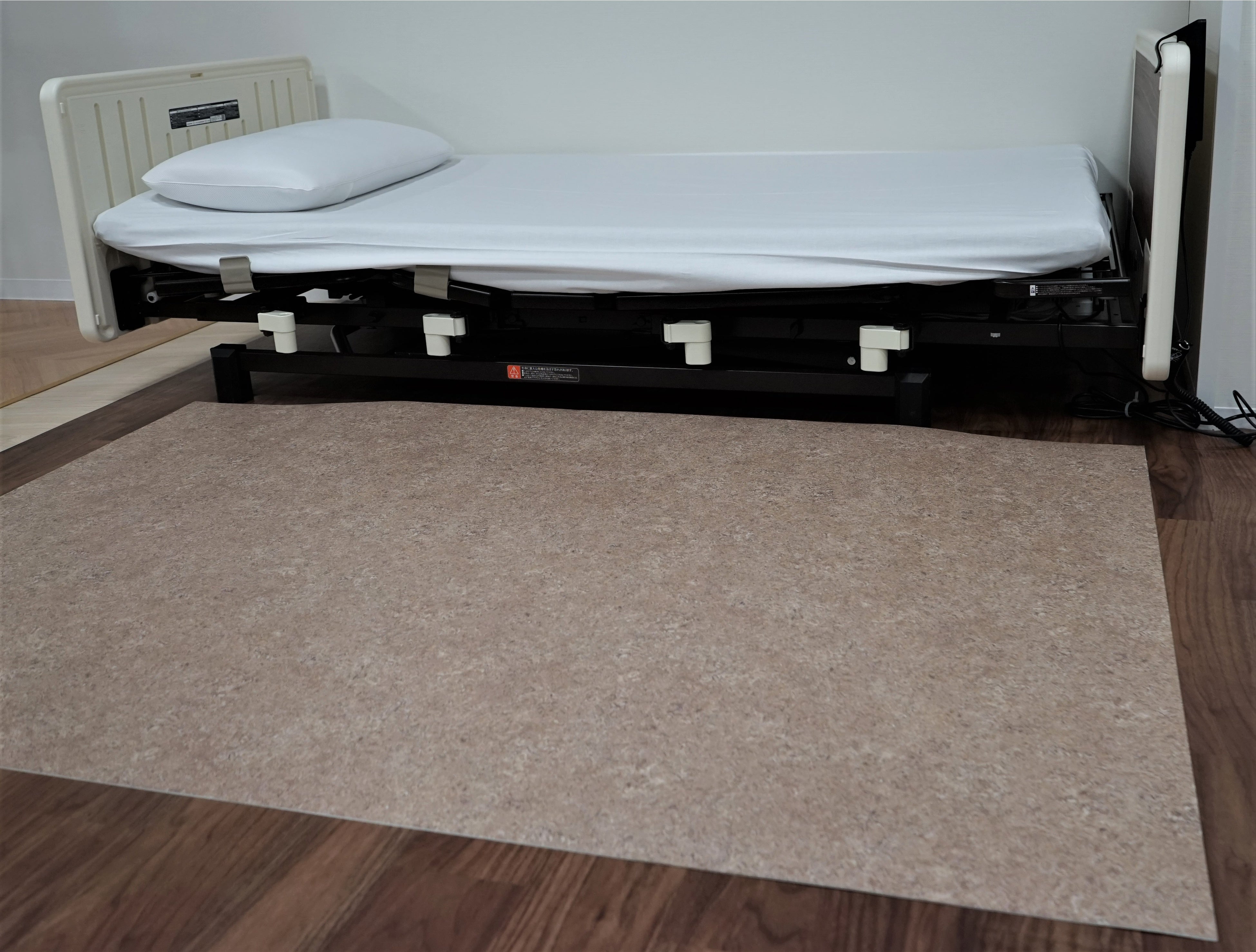 椅子やベッドからの転落、車いすへの移乗や歩行からの転倒時には、大きく沈み込み、大腿骨の骨折リスクを軽減する「衝撃吸収性」を実現しています。転倒時にはフローリングに対して約半分に衝撃を抑え、骨粗鬆症の大腿骨骨折の目安荷重(221kgf)を下回ります。
