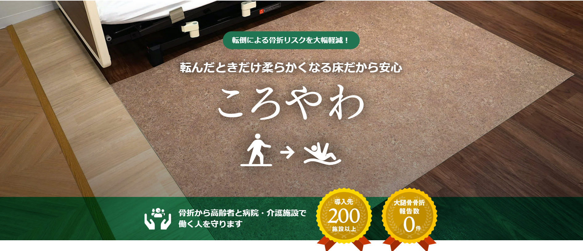 「ころやわ」は、これまで両立が困難とされていた「歩行安定性」と「衝撃吸収性」という2つの性質を、世界で初めて合わせ持つ新素材・構造を採用しています。200施設を超える医療機関・介護施設で導入されており、「ころやわ」上での大腿骨骨折は確認されておりません(2022年2月22日時点)。