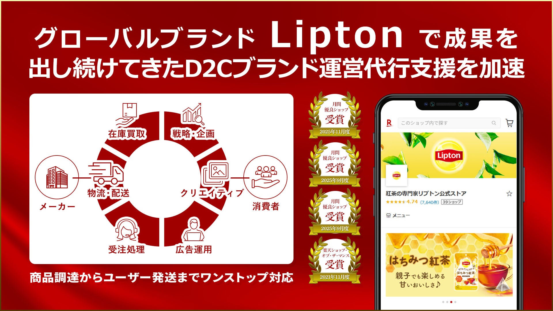 昨今、D2Cブランドの競争は激化し、商品企画・受注処理・広告運用・クリエイティブ制作・物流設計といった複数の業務を高いレベルで回す必要性が高まっています。こうした需要に応えるべく、当社はLipton公式D2Cストア運営で培ったノウハウを活用し、戦略設計から運営実行まで、ワンストップで支援体制を拡充し、メーカー各社のD2C成長支援をより強化していきます。