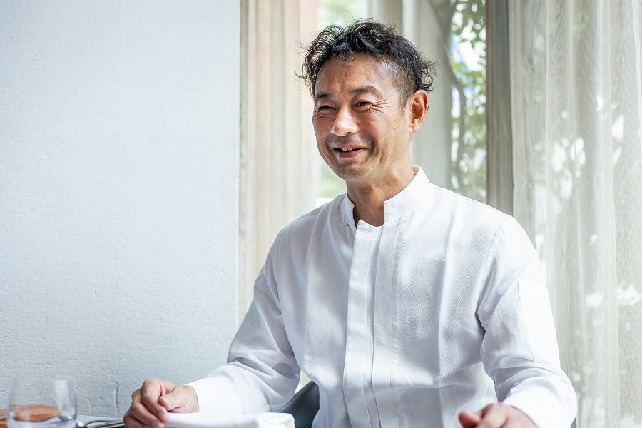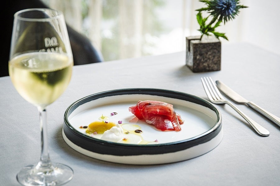 ○「リストランテ ホンダ」本多哲也シェフによる「戻り鰹のカルパッチョ、秋ナスと新ニンニクのピューレ添え」のCAVAペアリング