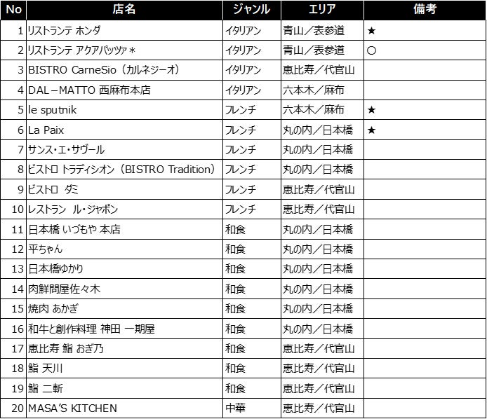 ・参加店舗:20店 ★はミシュランガイド掲載店。〇はヒトサラアワード2020の店。詳しい情報はWEBサイトをご覧ください