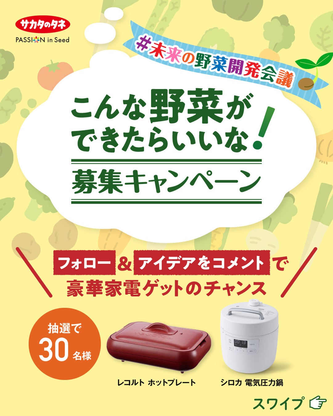 サカタのタネInstagram公式アカウント(@sakataseedcorp)をフォローの上、アイデアをコメントいただくと、抽選で「レコルト ホットプレート」もしくは「シロカ 電気圧力鍋」を計30名様にプレゼントします(※)。