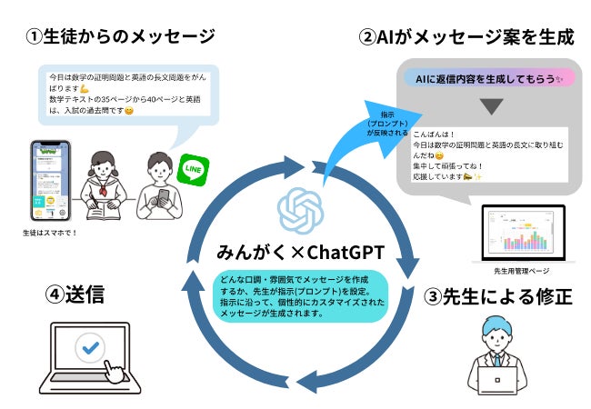 「確かに、全世界に衝撃を与えているChatGPTなどAIを有効活用したい。でも、AIに依存することできない。」そのような先生が、AIを優秀な部下と考え、先生自身が責任をもって指示を出すことで、教育現場で安心して活用できるAIサービスを開発しました。日々の教育現場で行われている「部下に指示を出し、生徒向け文面案を出させる。そのまま生徒に出せない内容があれば修正させる。そうして完成した内容を、先生が承認にして生徒に送信する。」という一連の流れを効率的に行うツールとお考えください。