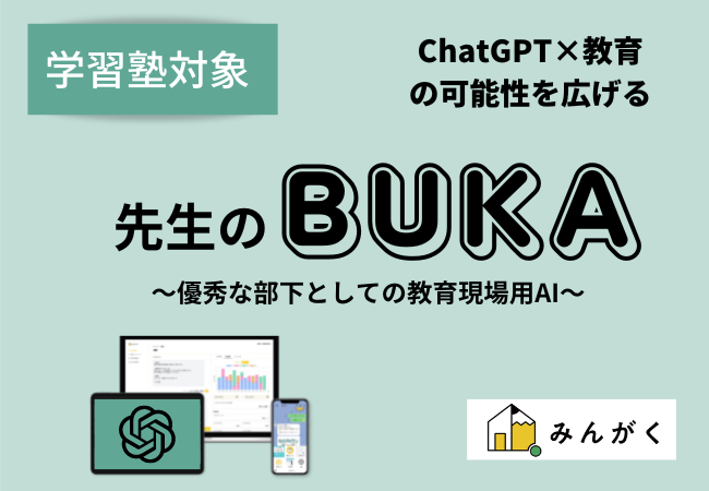 オンライン自習室サービス『みんがく』を運営する株式会社みんがく(本社:東京都目黒区、代表取締役:佐藤雄太)は、2023年3月25日、ChatGPT搭載の学習塾支援サービス「先生のBUKA~優秀な部下としての教育現場用ChatGPT導入~(β版)」のリリースを発表しました。今後は、教育現場でもChatGPTを活用し、先生は対面の生徒指導や面談など人間である先生しかできないことに注力したいというニーズが強くなっていくことが予想されます。しかし、「ChatGPTのリアルタイム回答に任せるのは、まだ不安で怖い」という先生が多いのも事実です。そのような先生方の課題を解決するサービスが「先生のBUKA~優秀な部下としての教育現場用AI~」です。