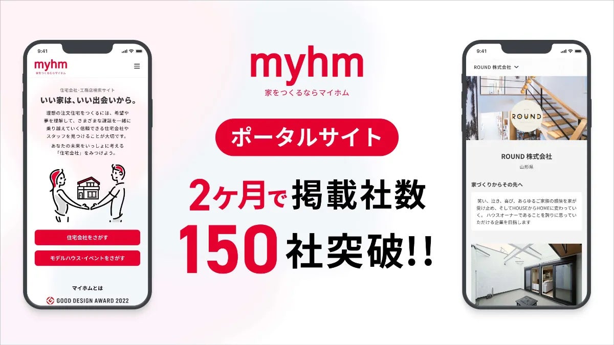 株式会社マイホム(本社:東京都港区、代表取締役:乃村⼀政・⾦箱遼、以下マイホム)が3⽉1⽇にリリースした注文住宅のポータルサイトの掲載社数が、4月22日で150社を突破いたしました。マイホムが掲げる、「家をつくる体験を変えよう。」という想いに共感くださる住宅会社が多く集まり、わずか2ヶ月足らずでの150社にご参加いただきました。