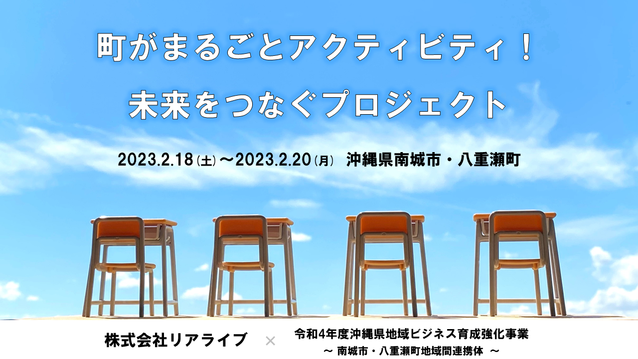 本企画は、リアライブの強みである「教育」の切り口から沖縄県の地域、小中学校ならびに中小企業の活性化を目的とし、地方創生に貢献したいという想いから生まれました。当日は、南城市立佐敷中学校の生徒が企画した沖縄県の魅力を伝える観光ツアー型インターンシップをモニター生として大学生(*5)に体験していただきます。
