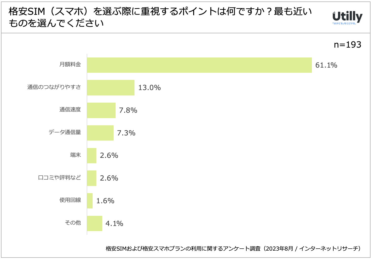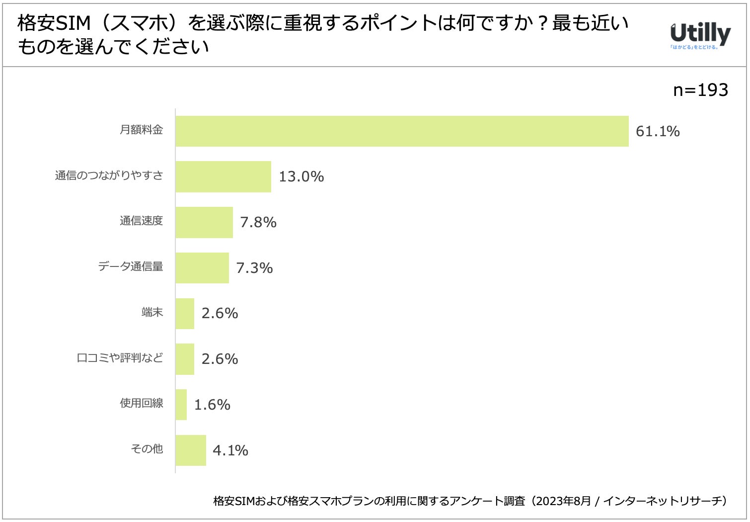 利用者および利用検討者に格安SIM(スマホ)を選ぶ際に重視するポイントについて質問したところ、「月額料金」が61.1%、次いで「通信のつながりやすさ」が13%という結果になった。