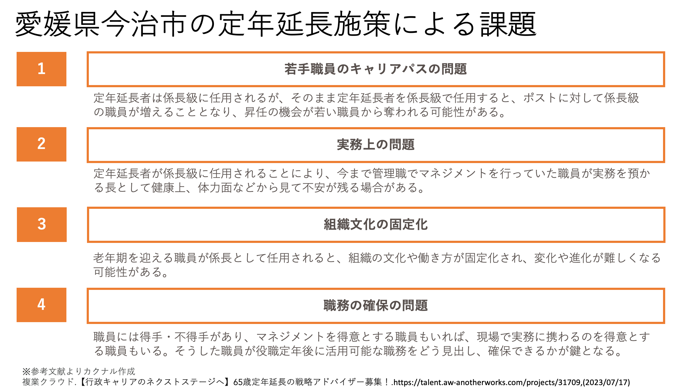 就業環境やライフスタイルが大きく変化する中、定年延長への取り組みはより重要なものになっております。しかしそこにはキャリアパスや組織の活性化など、多様性のある働き方実現に向けた課題が多く存在します。これまで、新潟県津南町や徳島県海陽町などの地方自治体で行ってきた人事制度構築の専門性を活かし、今治市を支える人々の働き方と持続可能なまちづくりに貢献してまいります。