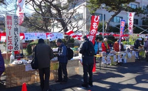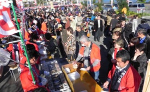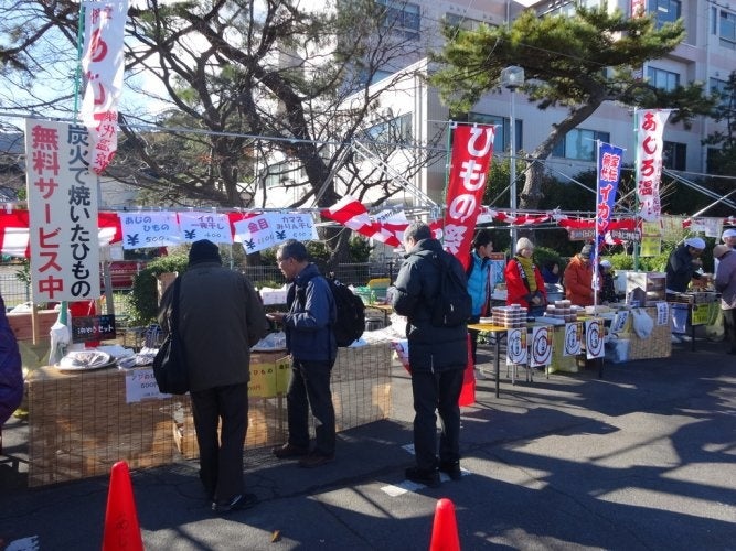 地場産品やひものなど、網代ならではのグルメが並ぶ!!脂ののったアジのひものを炭火で焼いて無料配布