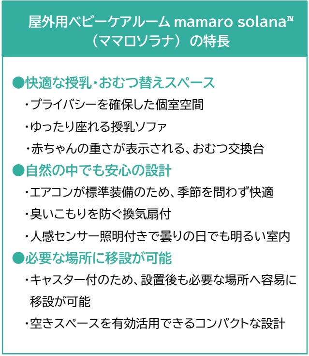 当社は「快適で安全な環境を創造する」理念のもと、今後も赤ちゃんとそのご家族が、より快適に過ごせる環境づくりを目指し、全国の観光地や公園、商業施設などへmamaro solana™(ママロソラナ)の展開を積極的に進めてまいります。