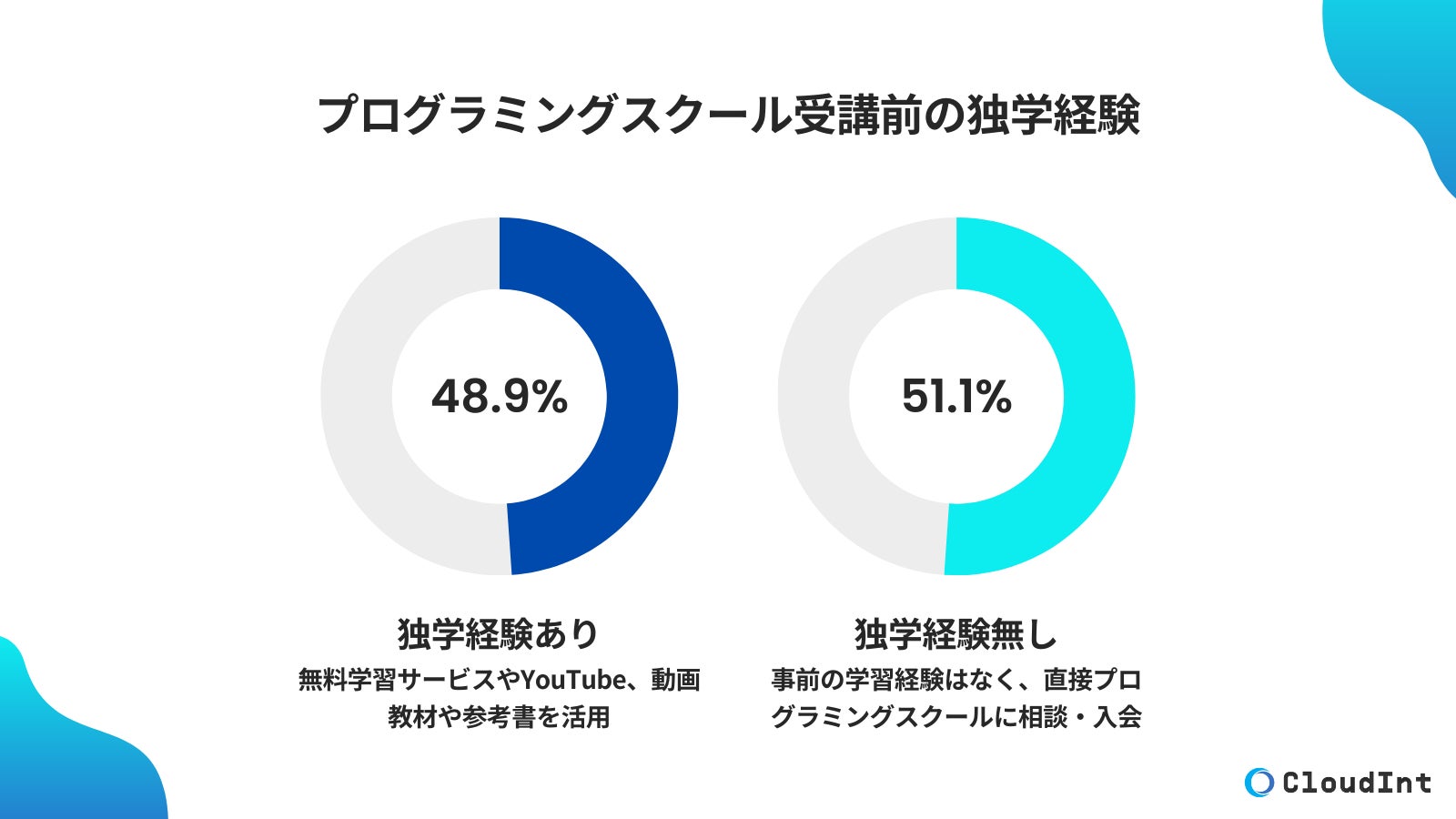 プログラミングスクール情報メディア「CloudInt」は、プログラミングスクール受講生が、受講前に独学経験があったかどうか、独学後にプログラミングスクールを受講した理由・背景に関する調査結果を発表しました。