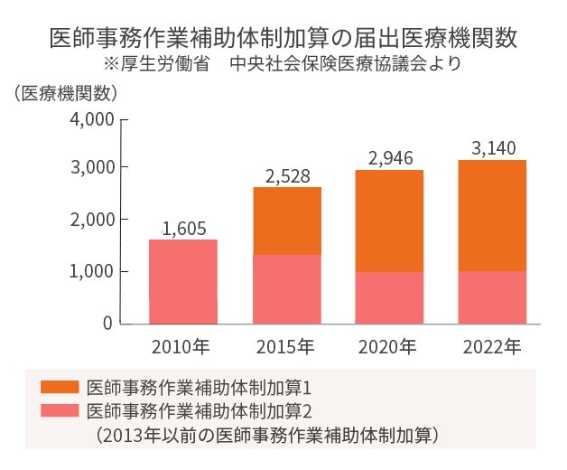 医師事務作業補助者は、医療機関で医師の代行として診断書の文書作成や電子カルテへの入力などの事務作業を補助し、医師が診療業務を円滑に行うことができるようサポートする職種です。2008年度、勤務医の負担軽減を目的とした「医師事務作業補助体制加算」が開始、医師事務作業補助者の配置が評価対象とされ、2016年には対象病院の範囲がさらに拡大するなど、急速に配置が拡大してきました。