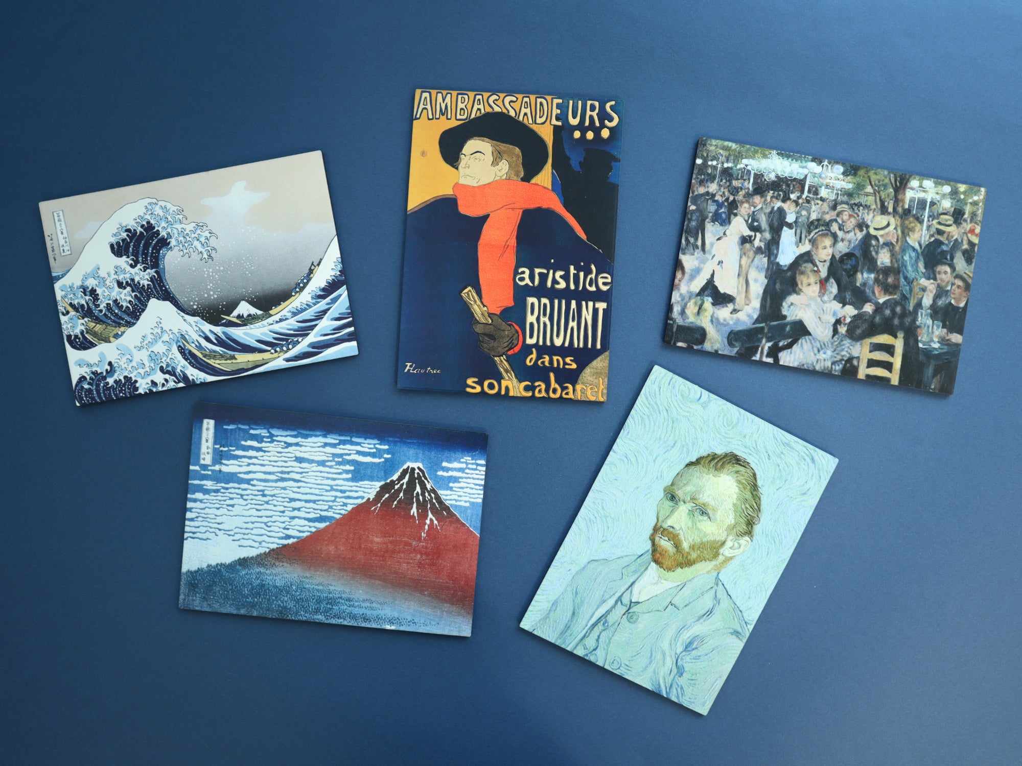 (上段左から)葛飾北斎「神奈川沖浪裏」、ロートレック「アリスティード・ブリュアン」ルノワール「ムーラン・ド・ラ・ギャレットの舞踏会」、葛飾北斎「凱風快晴」、ゴッホ「自画像」