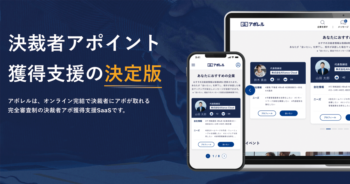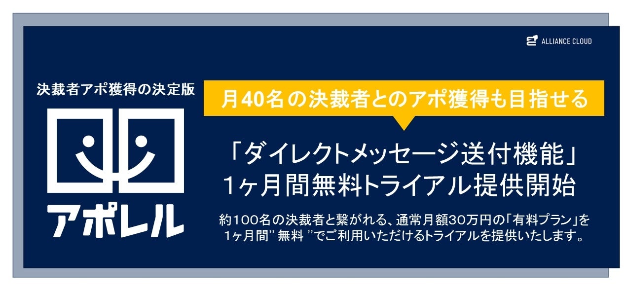 決裁者アポイント獲得支援SaaS「アポレル」を運営する株式会社アライアンスクラウド(本社:東京都目黒区、代表取締役:宮崎 翔太 以下「当社」)は、ターゲット企業の決裁者とのアポイントを設定できる決裁者アポ獲得支援SaaS「アポレル」にて、決裁者同士のマッチングをさらに推進することを目的に、この度サービスデザインのリニューアルを実施しました。