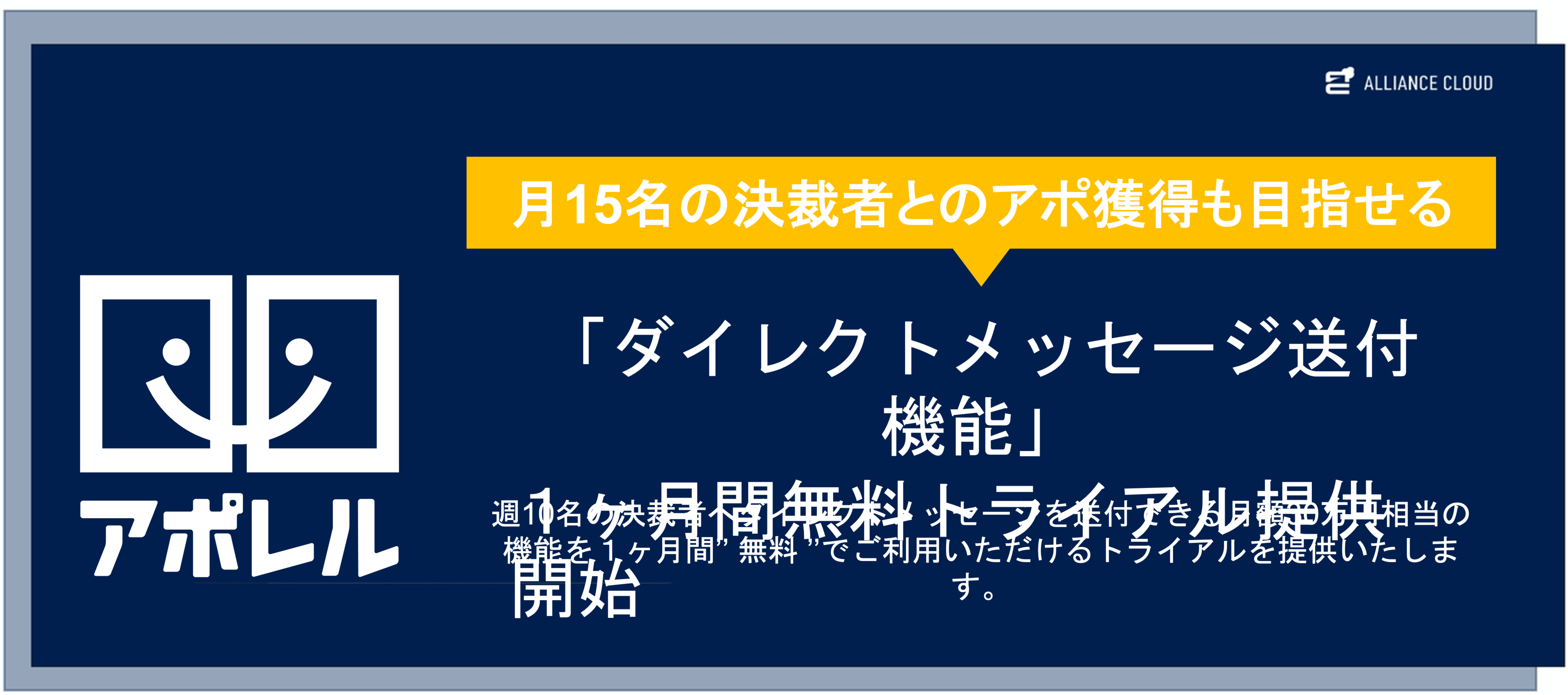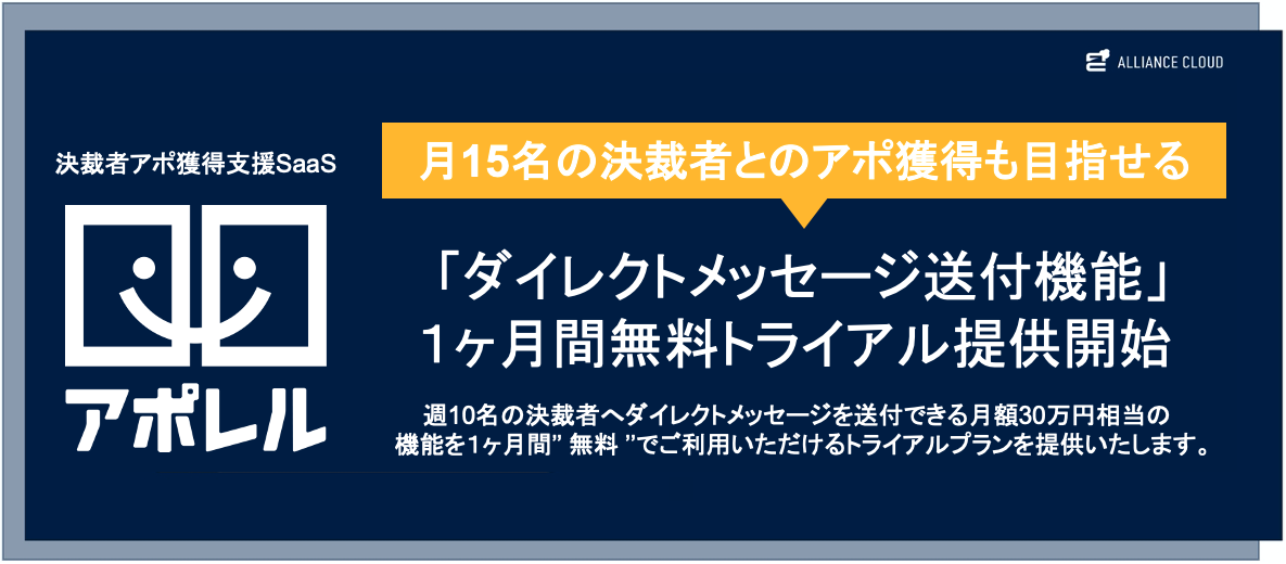 決裁者アポ獲得支援SaaS「アポレル」、自社のターゲット条件を元に決裁者を検索しアポを設定できる機能を1ヶ月無料利用できるキャンペーン開始。月15名の決裁者アポ設定も実現可能。