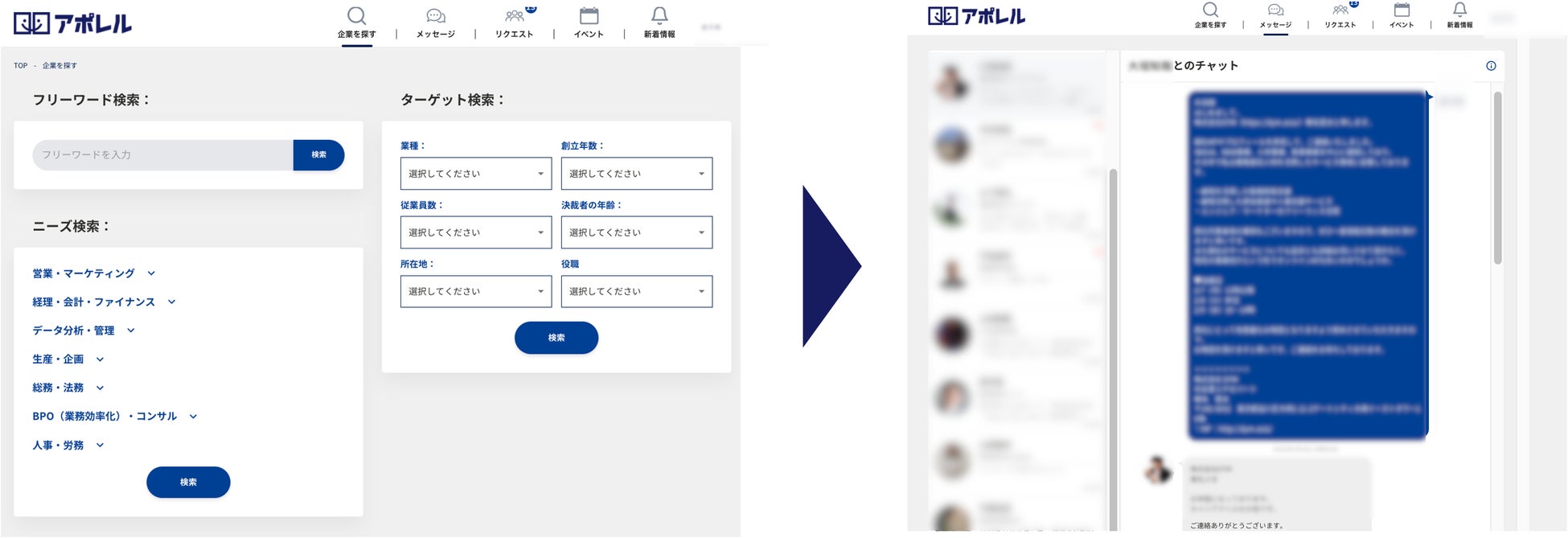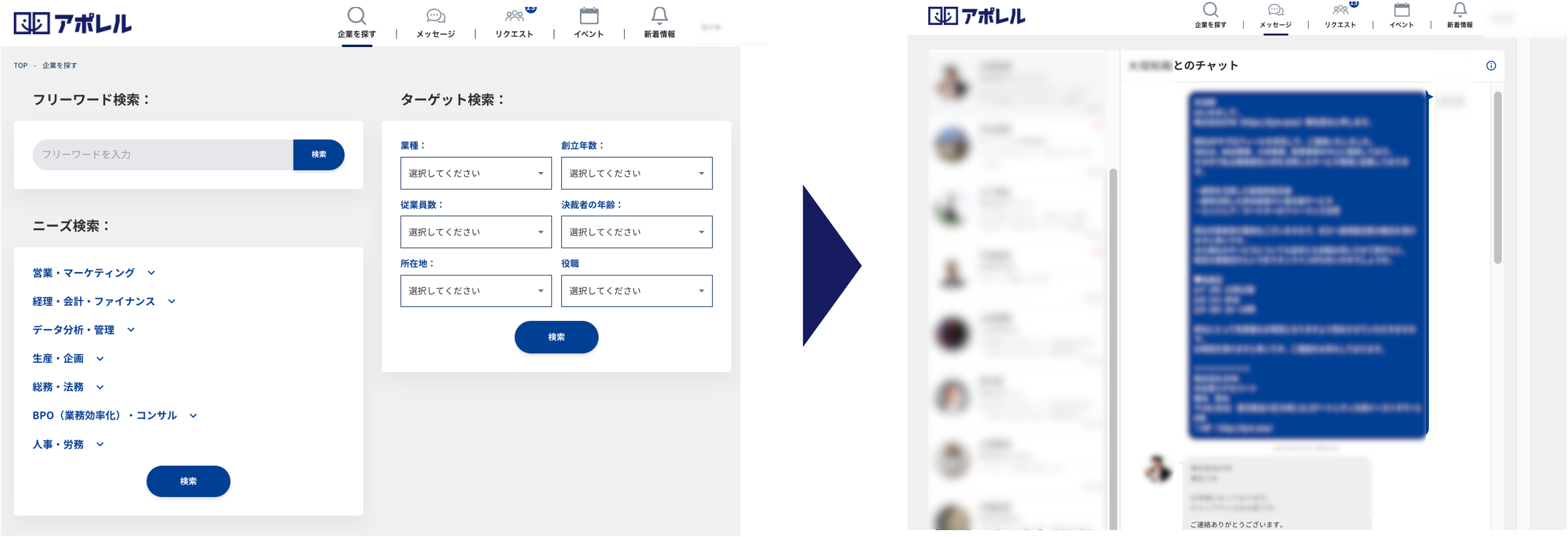 具体的には、データベース上で“従業員数”や“業種”といった基本情報、さらには“購買ニーズ”(何を、いつまでに、どのくらいの予算で購入したいか)で企業の決裁者を絞り込み、ダイレクトメッセージを送ることができます(週に10名まで)。ダイレクトメッセージを読んだ決裁者が商品やサービスに興味を持てばマッチング成立となりアポイントの調整を行えます。