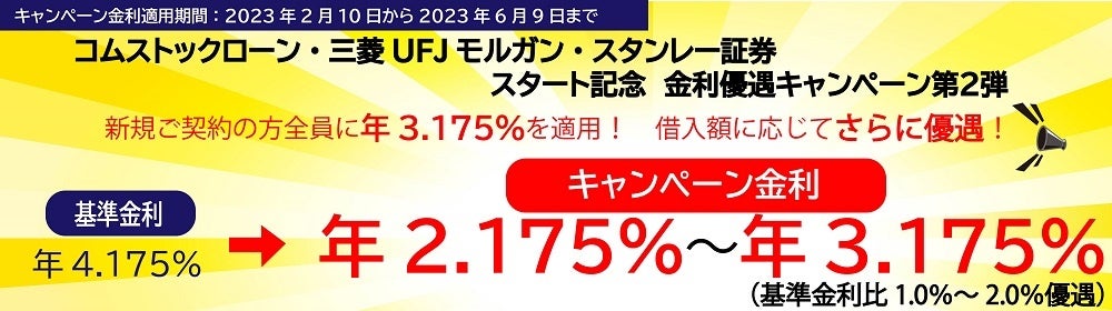 今般、より多くのお客様にご利用いただくため、期間限定のキャンペーンとして「コムストックローン・三菱UFJモルガン・スタンレー証券」を新規ご契約のお客様全員に特別優遇金利の年3.175%を適用いたします。