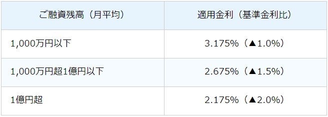 さらに、キャンペーン期間中は、ご契約後も、ご融資残高(1日から月末までの平均)に応じて、翌月10日から翌々月9日まで特別優遇金利(年2.175%~3.175%)を次のとおり適用いたします。