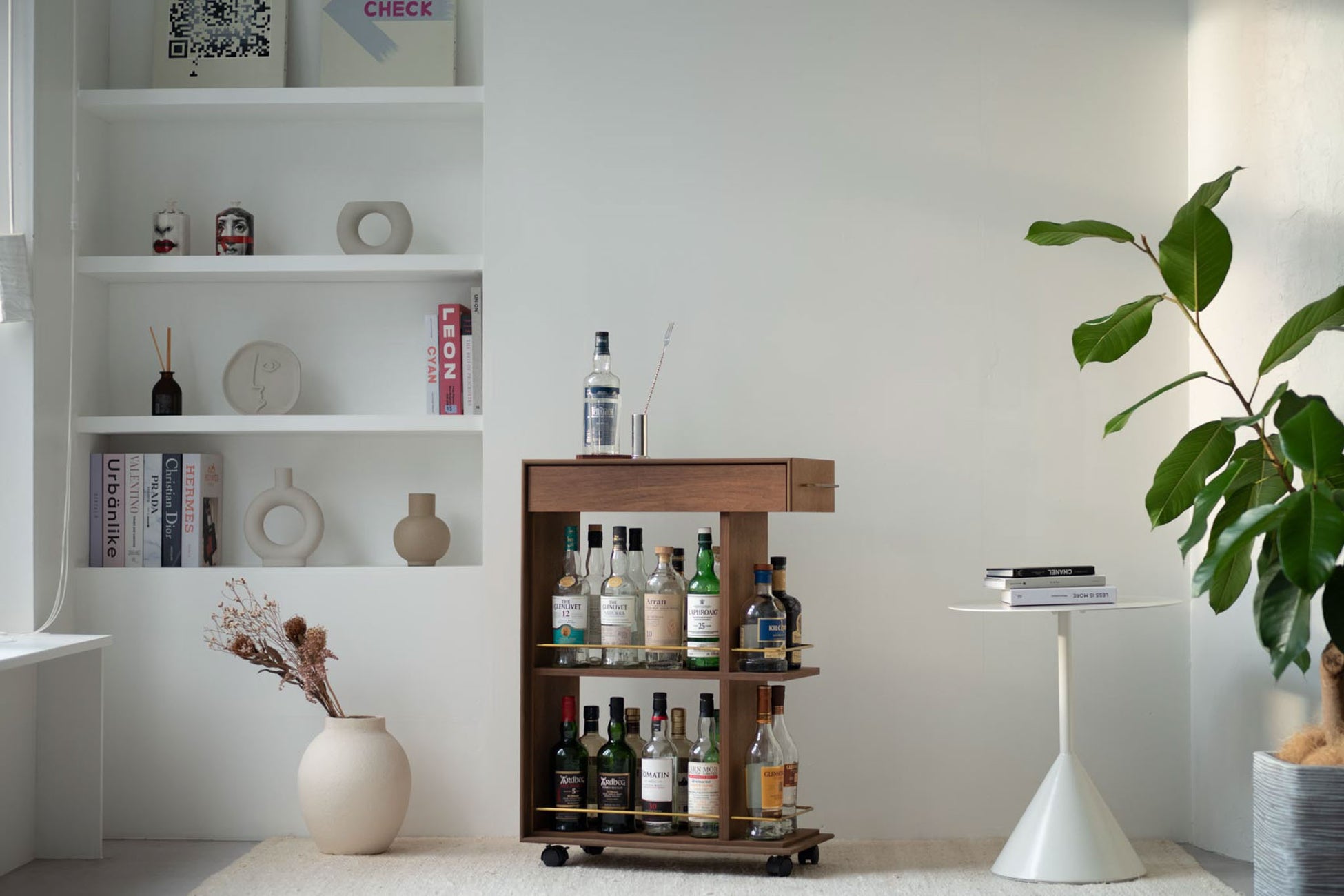 PYTHGORAは主に家庭用の家具販売を行なっており、2022年5月に販売開始した「バーワゴン」は累計100台以上の販売実績を持つ人気商品。他にもオーセンティックバーやレストランなど、飲食店にもボトル収納棚をこれまで数多く製作した経験があります。また昨年は「Internatinal BAR SHOW 2023」に出展されたBAR TIMES様のブース内にPYTHAGORA製品を展示什器としてご利用いただきました。数多くのバー家具製作経験により培った、このジャンルならではのポイントを抑えた新商品「バーシェルフ」となっています。