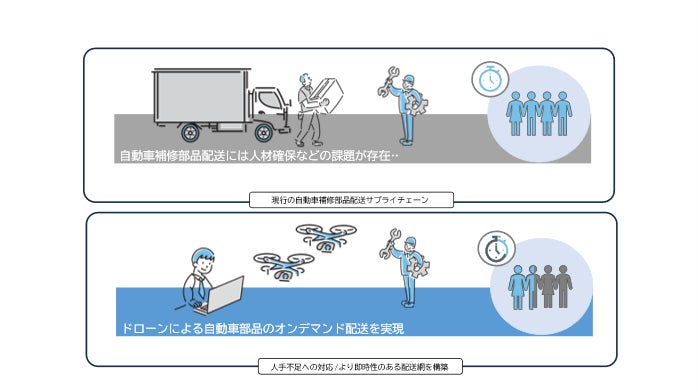 自動車部品の配送をドローン配送で実現できれば凄いことだと思います。車種ごとにも異なる様々な部品が速く届き、車をすぐに修理する事ができるならば、私たち自動車整備企業のお客様も一番うれしいことだと思います。