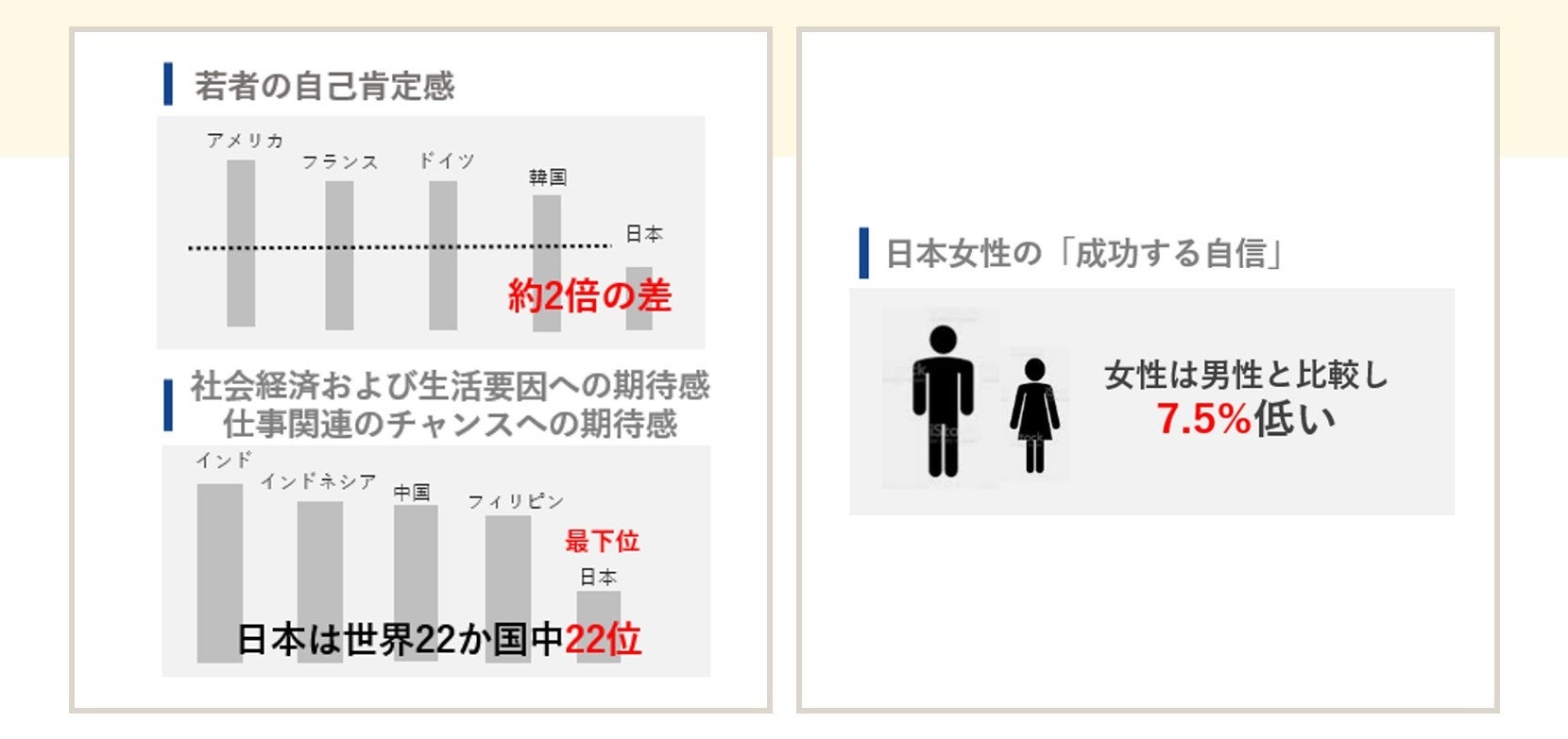 現代の日本は、自己肯定感の低さが先進国ワースト1であることに加え、女性の方が男性よりも7.5%も低いという結果も出ており、女性の社会進出を妨げる大きな社会課題となっています。このような状況の中、女性も男性も関係なく社会の中心で活躍できる時代が目の前まで来ています。