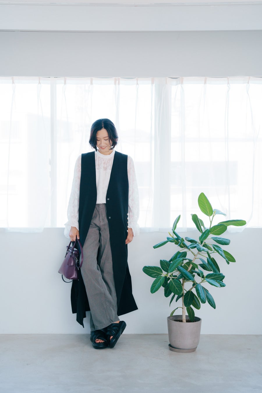 長い着丈のジレのため、高身長女性にとって2つの嬉しいことが叶います。まず、お手元にある”残念なサイズ”のアイテムが復活すること。そして、2つ目は重ね着が前提の着回しアイテムとして、真夏から真冬まで“このジレ1枚”でコーデが格上げされることです。ぜひクローゼットに追加して、コーディネートを楽しんでください。
