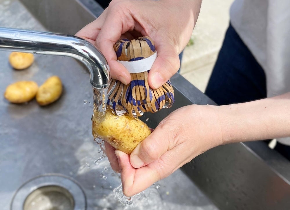 共同研究の中で、自社製アクアコート原紙の耐水性の高さを生かし、水を使う場面で使える作品を検討した結果、学生の創造豊かな発想よりイノベーティブなアイデアが生まれました。その作品の一つが「紙たわし」です。調理器具や野菜の洗浄のほか、さまざまな道具の手入れや掃除など幅広い用途で使用できるたわしに着目しました。