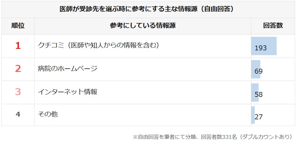 「クチコミ(医師や知人からの情報を含む)」が最多回答(回答者数331名中193名)