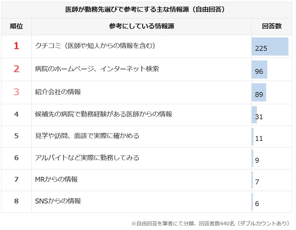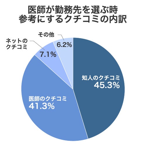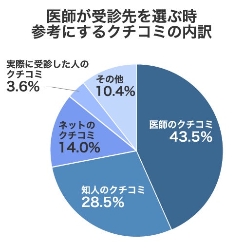 今回の調査では、医師の3分の2以上が病院を選ぶ際に「クチコミを参考にする」と回答しています。クチコミの中でもインターネットより知人・同僚医師の声を信頼する傾向が強く、クチコミの信ぴょう性への疑問や自ら実情を確認する必要性も指摘されました。