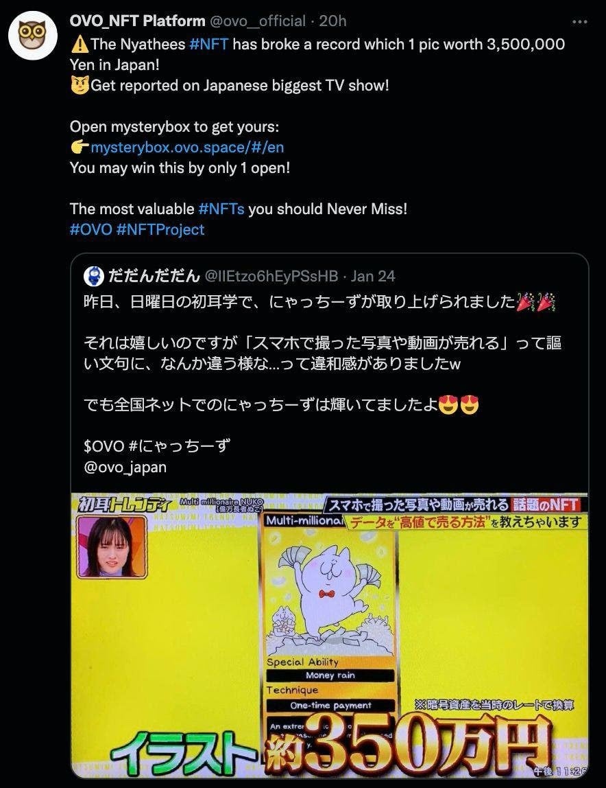 2022年1月23日にOVOはMBS(TBS系列)人気番組「日曜日の初耳学」に取り上げられた。