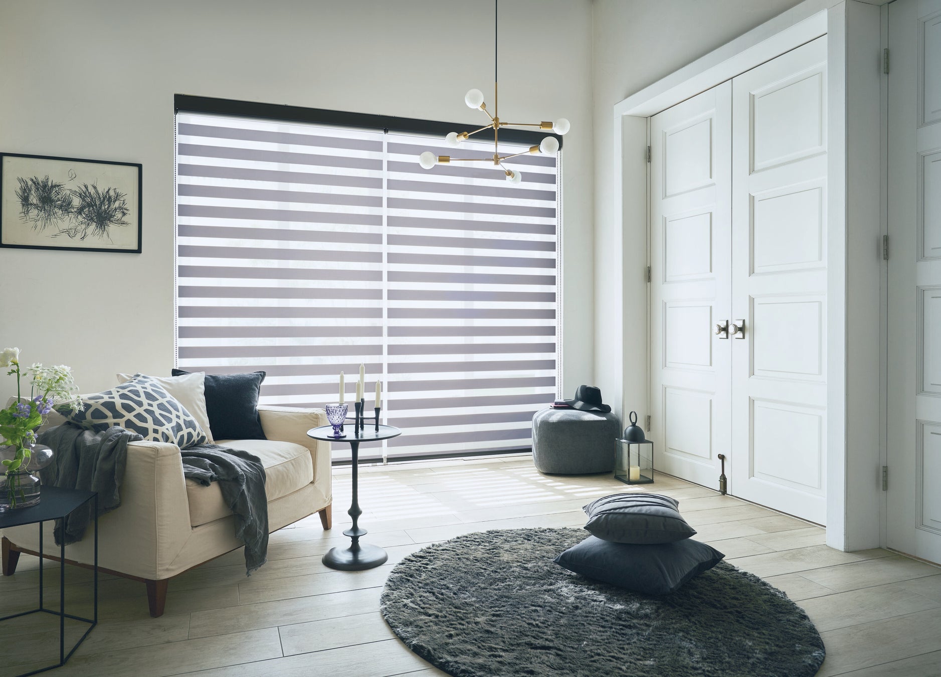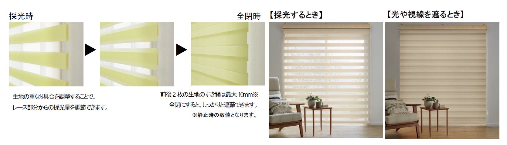 1枚にドレープとレースを交互に組み合わせたボーダー状の生地を前後に配置し、生地の重なり具合を調整できるロールスクリーンです。調整することで、室内にやわらかな光を採り入れ、外からの視線を気にせずに眺望を楽しめます。