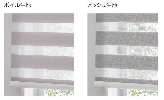 そこで、レース部がボイル地になっている無地生地の「フロリエ」や、遮光生地の「ノネット」を拡充。「クエンテ」「ダンテ」のメッシュ地と比較し、採光時の透け感が選べ、選択肢が広がります。